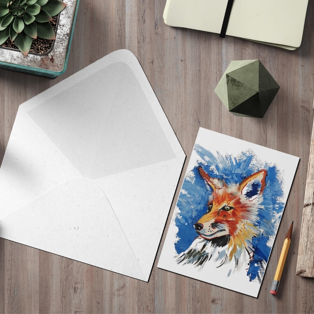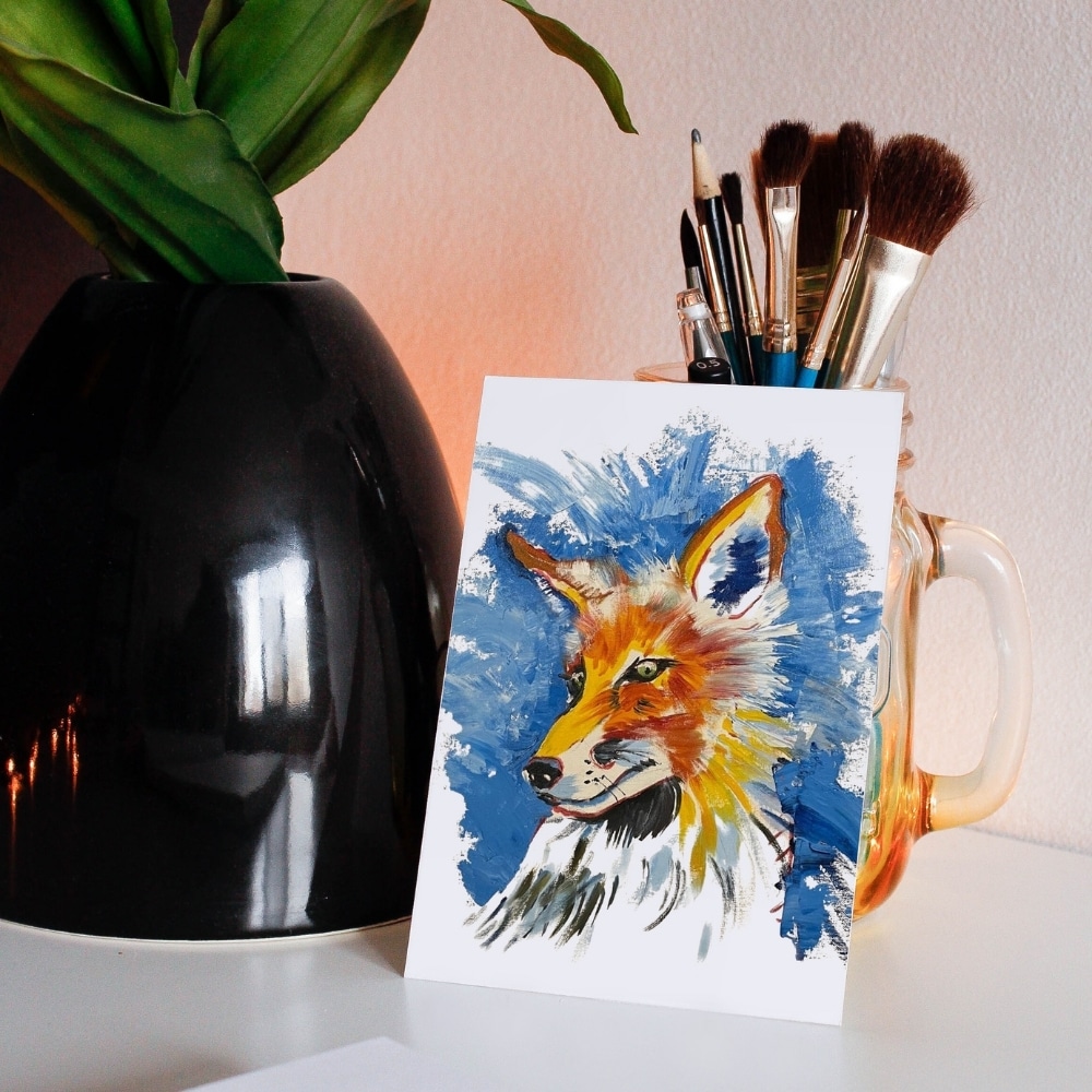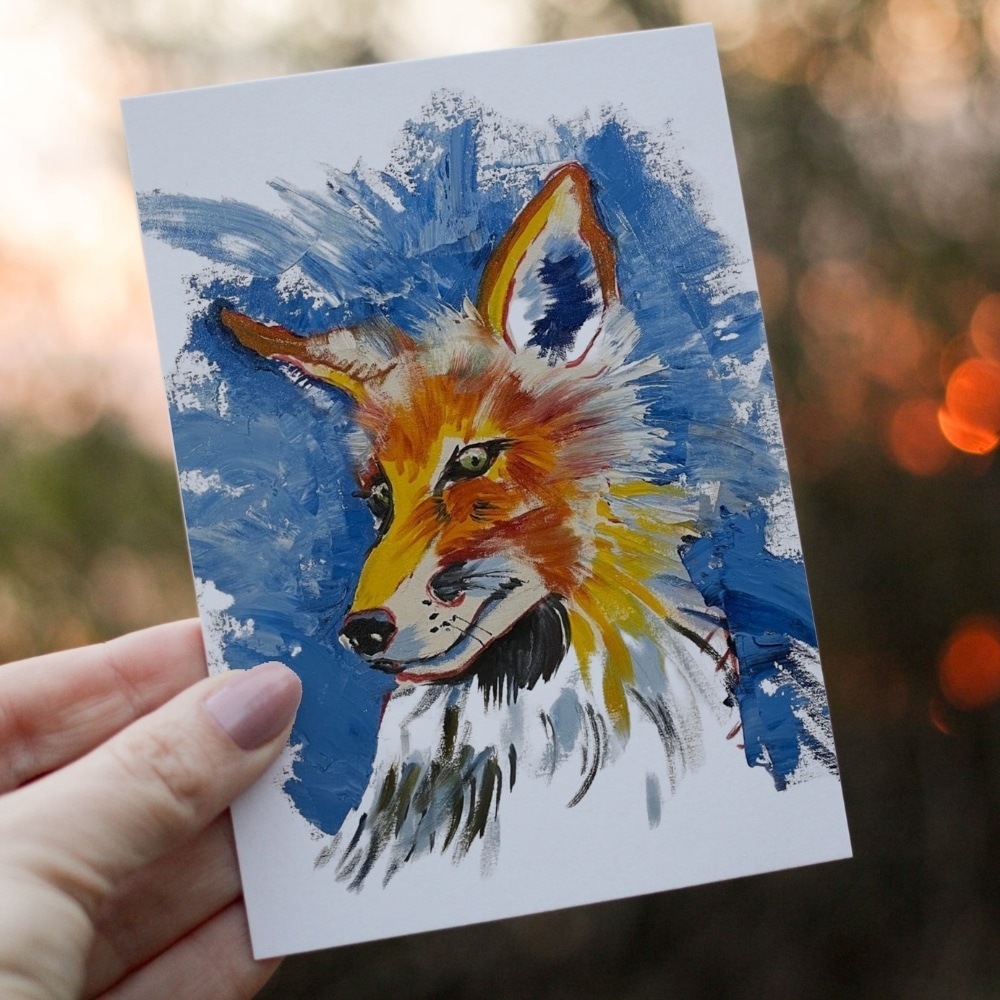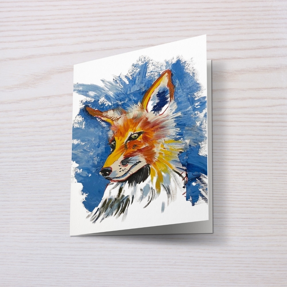 A playful 5×7 inch greeting card featuring a colourful fox painting from the Little Brushstrokes by Sophia collection. Blank inside for your message.
