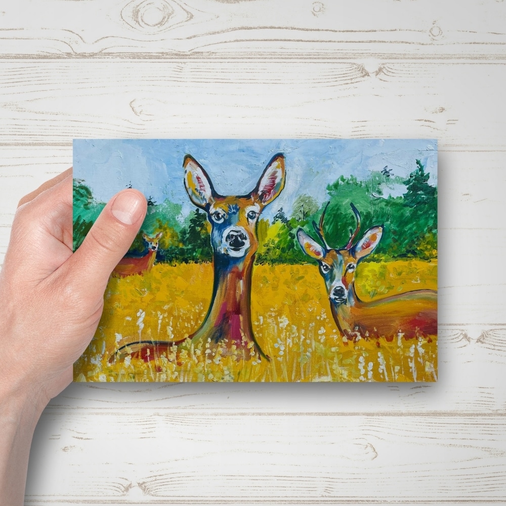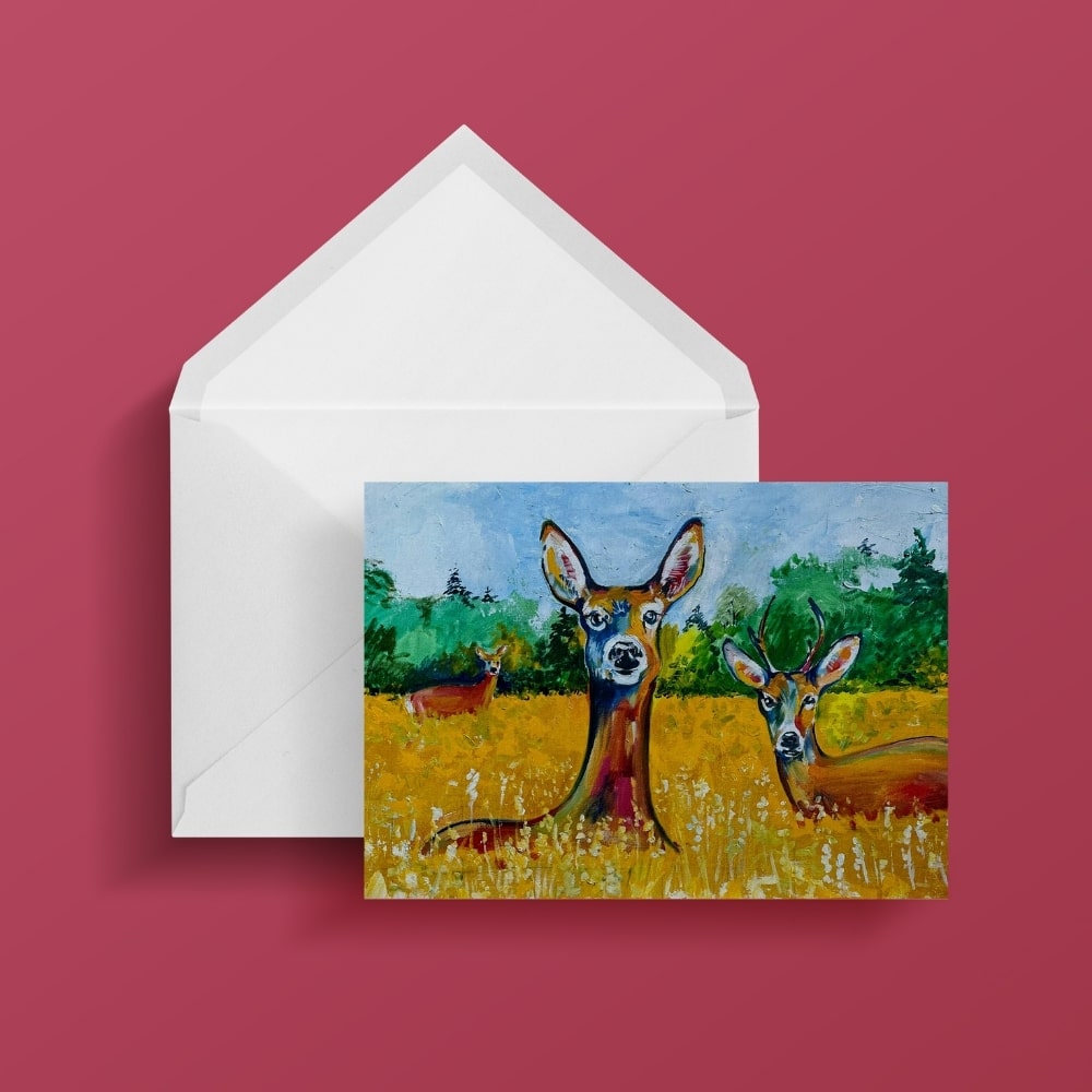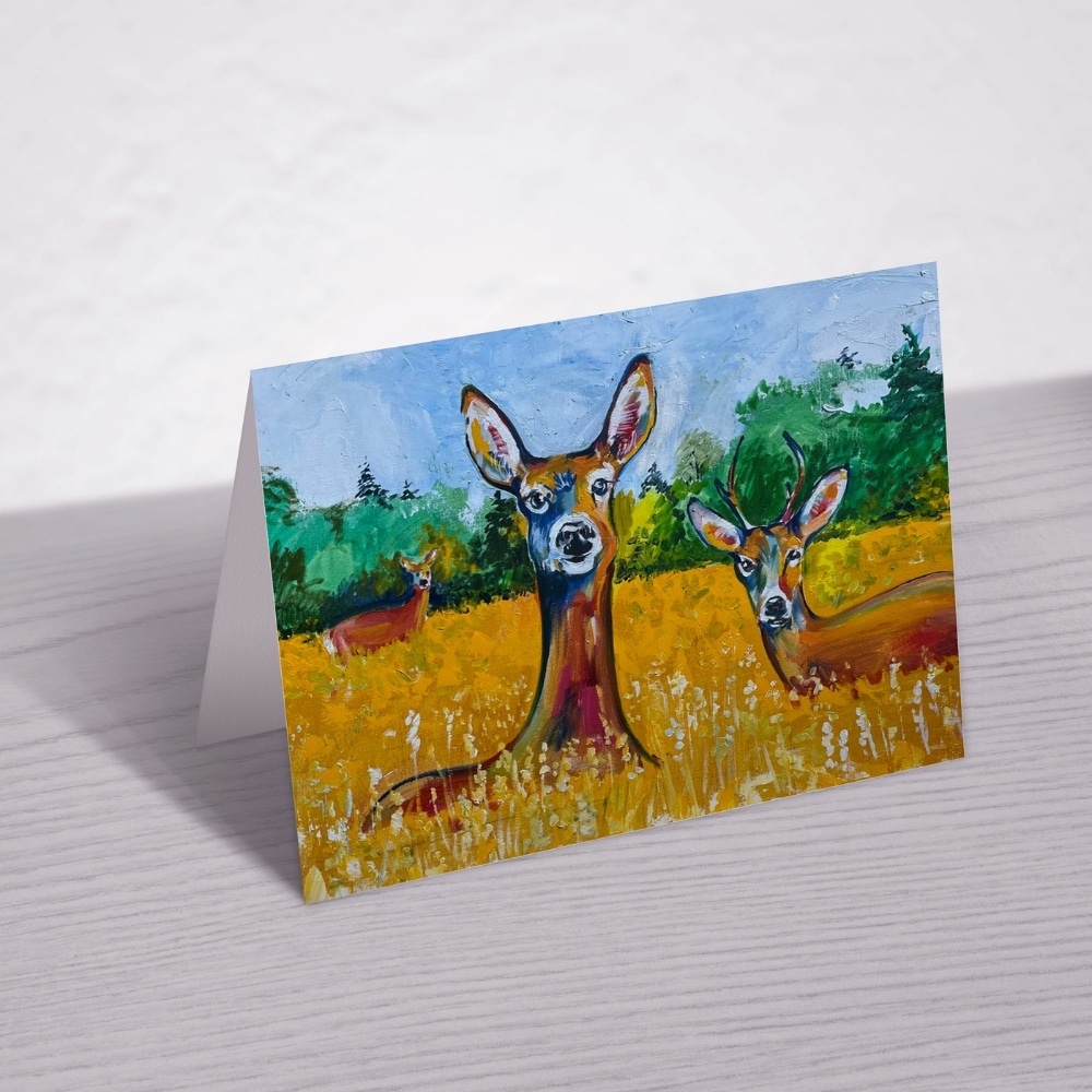 Share a moment of calm with our 5×7 inch greeting card, Deer in a Field. This elegant design, taken from an original painting, shows three deer standing gracefully in a tranquil countryside scene, capturing the quiet beauty of nature.
