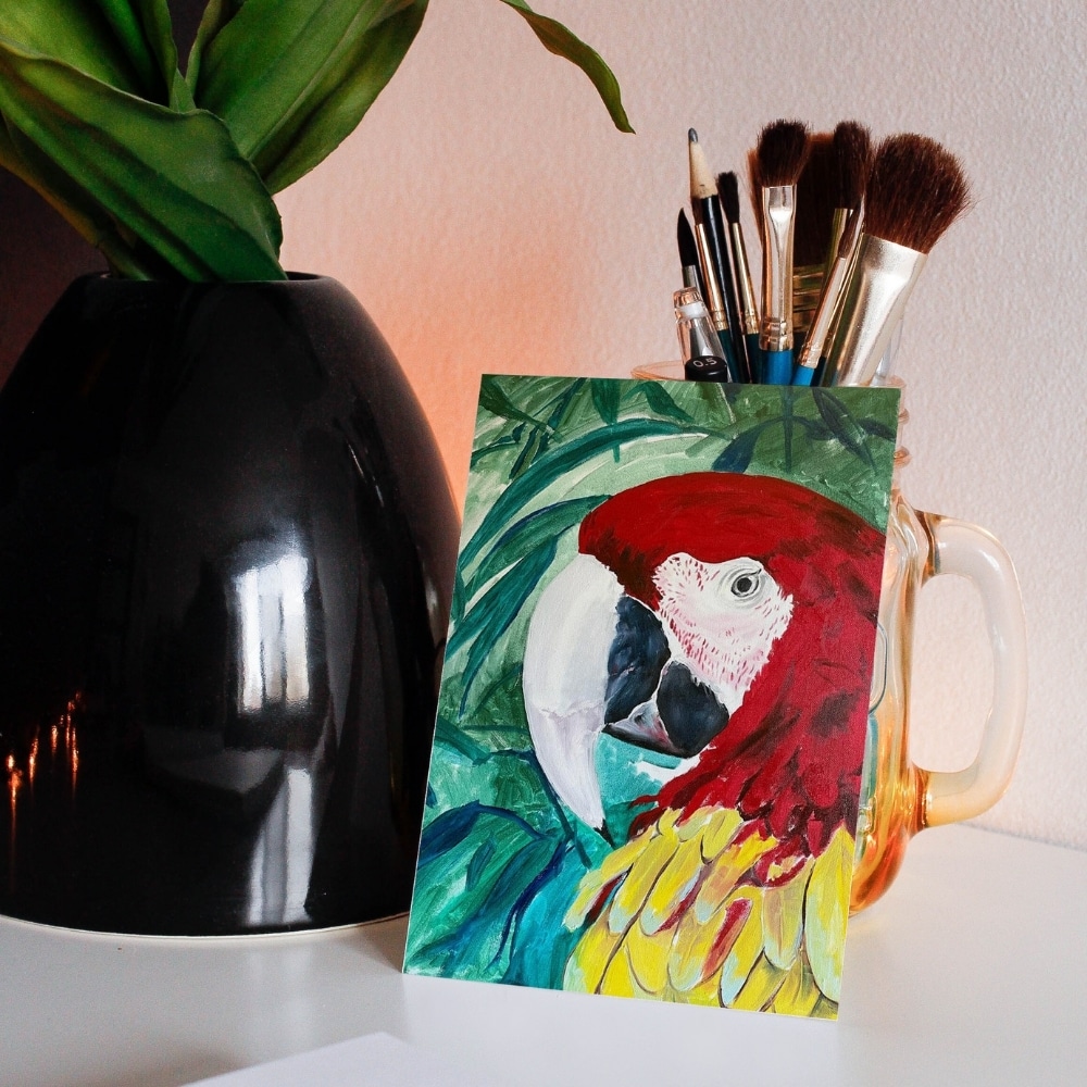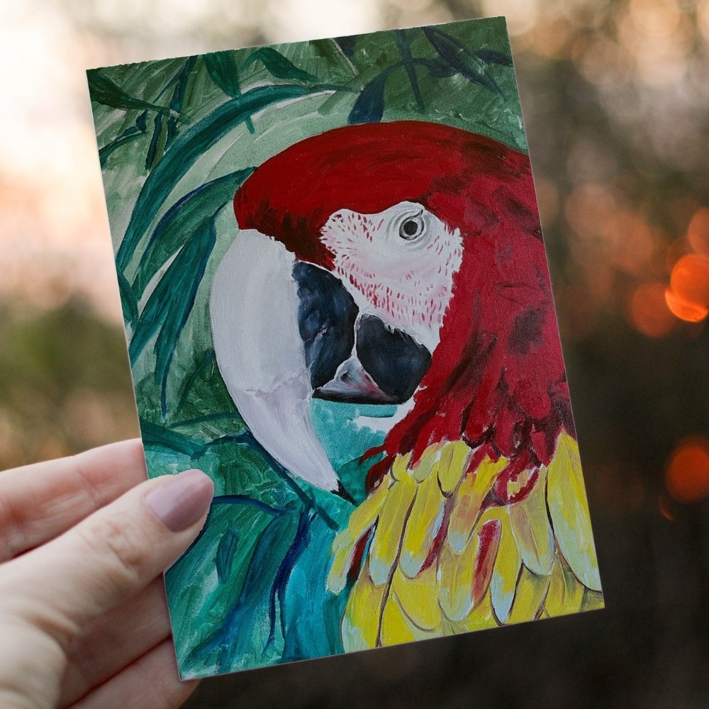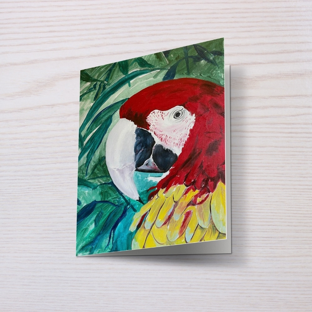 A vibrant 5×7 inch greeting card featuring Polly the Parrot, bursting with tropical colour and charm. Blank inside for your personal message.