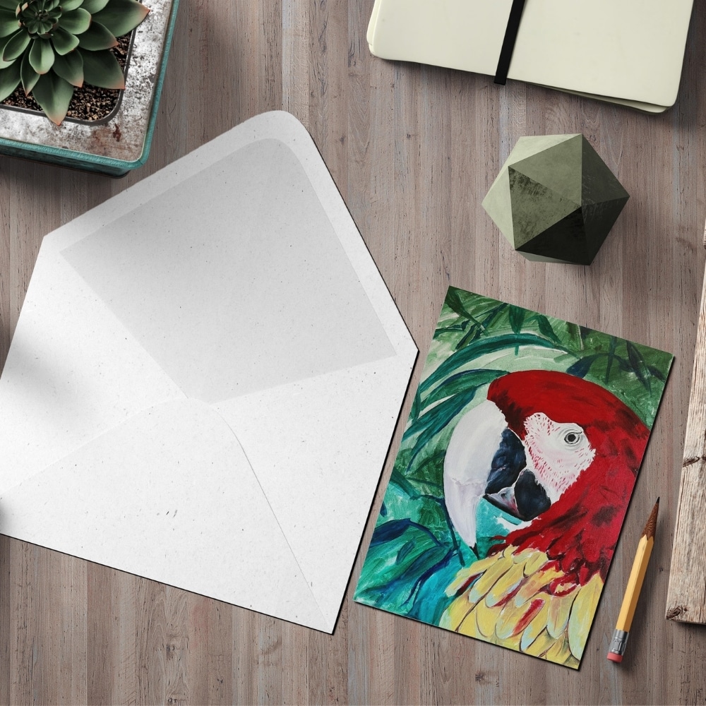 Add a splash of tropical colour to your greetings with our 5×7 inch card, Polly the Parrot. This lively design, taken from an original painting, captures the beauty and personality of Polly in vivid detail, celebrating nature’s brightest feathers and boldest hues.