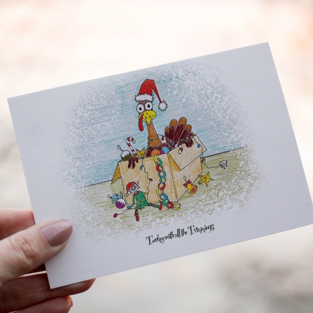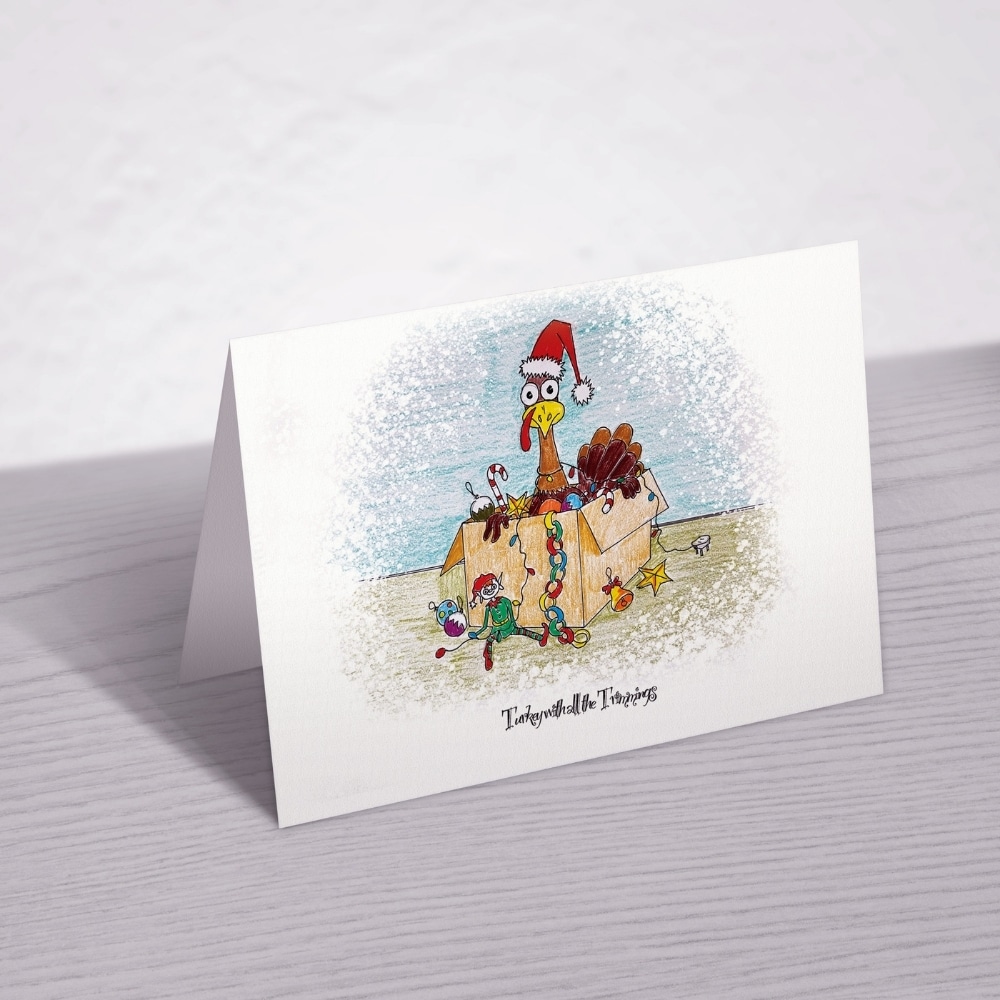 Celebrate Christmas with a smile using our 5×7 inch Christmas card, Turkey and all the Trimmings. This fun design captures the joy and chaos of the traditional festive meal, complete with a cheeky twist on the much-loved Christmas dinner.